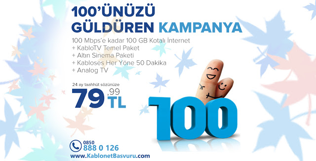+ 100’ünüzü Güldüren Kampanya kapsamında müşteriler; 100 Mbps’ye kadar 100 GB Kotalı Kablonet tarifesine, KabloTV Üst Paket + Analog KabloTV’ye, Kabloses Her Yöne 50 dakika paketine ve Altın Sinema Paketine abone olacaklardır.