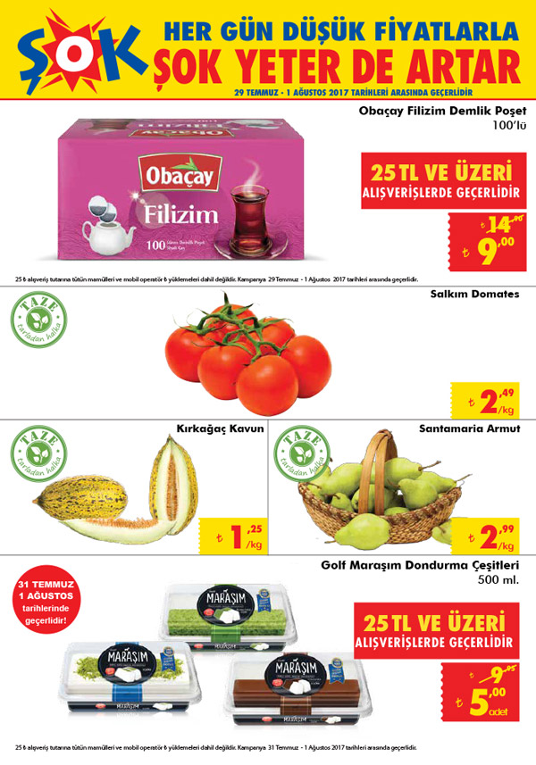 Google Plus, Facebook, Twitter ve Instagram hesaplarımızdan bizi takip ederek güncel indirimli ürünleri ya da indirim kupon kodlarını yakalayabilirsiniz. Çaylarda kampanyalı fiyatlar var. Obaçay Filizim sadece 9.00 TL. 25 Lira ve üzeri alışverişlerinizde başka indirimli ürünlerimiz de var. Şok indirimli aktüel ürünler kataloğundan güncel kampanyaları ve fırsat ürünlerini takip edebilirsiniz. Domates, armut ve kavunun yanında Gol Maraşım dondurma çeşitleri de sizleri bekliyor.