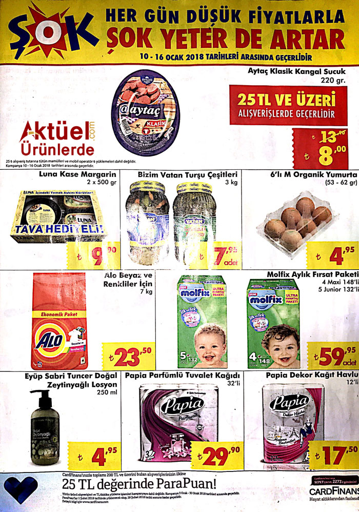 Şok mağazalarının çarşamba günleri getirdiği indirimli ürünler 10 Ocak 2018 tarihinde de tüm Şok şubelerinde indirim reyonlarında olacak. İndirimli ürünleri herkesten önce tedarik etmeye çalışsak da bazan bizden önce yakalayanlar da oluyor. Aktüel ürünlerde sayfasını tebrik ediyoruz onlar da bizim gibi sizlerin indirimli ürünleri herkesten önce öğrenmeniz için çabalıyor. Biz de bu defalık onlardan alarak sizlere duyurmaya çalıştık çarşamba Şok indirim kataloglarını. 10 Ocak 2018 tarihinde hangi ürünlerin geleceği çokça merak edilmiş ama internet sitesine yüklenmeyen kataloglar insanımızın bu hafta hangi ürünlerin indirime gireceği konusundaki merakını daha da artırdı.