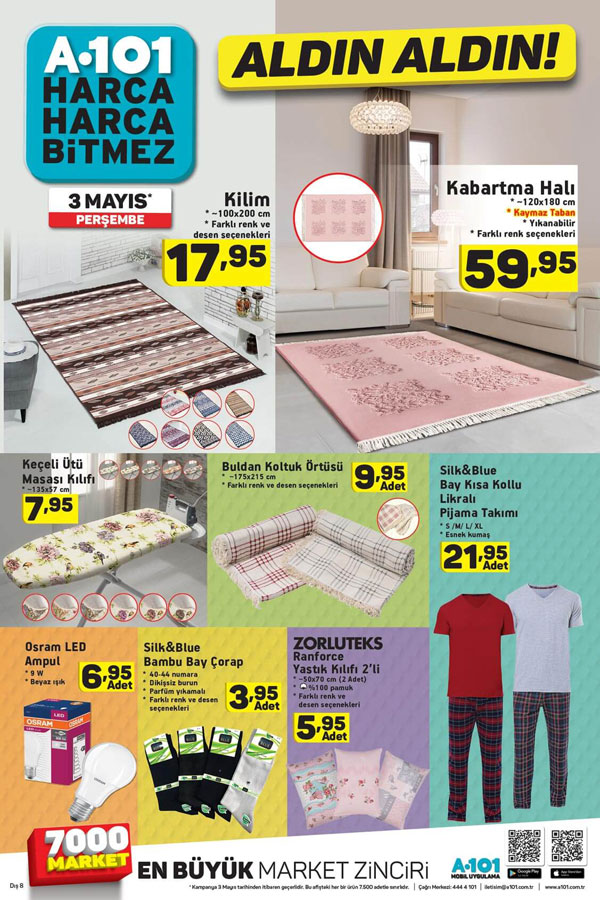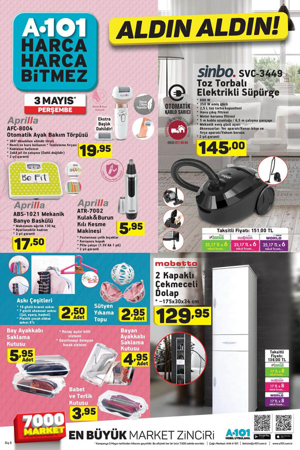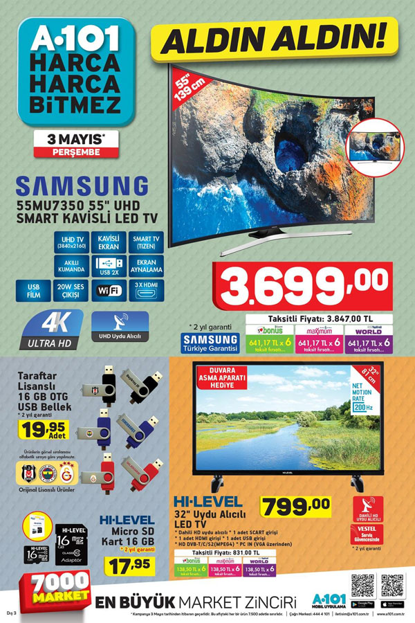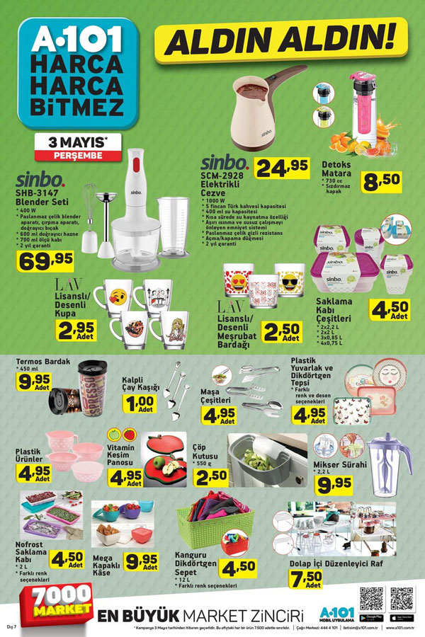 A101 fırsat günlerinde hesaplı ürünlerin ucuz ücret yaftalarıyla yurttaşlarla buluşacak olması ve pek çok ürünün stoklarla hudutlu sayı ve renkte olması neticesinde erken saatlerde ürünlerin tükenmesine kapı aralayabiliyor. 3 Mayıs 2018 tarihinde çeşitli ürünlerde muhteşem indirimlerin ve kampanyaların bulunduğu A101 güncel ürün broşürlerini ilk siz öğrenmek istiyorsanız takipte kalmaya devam edin.