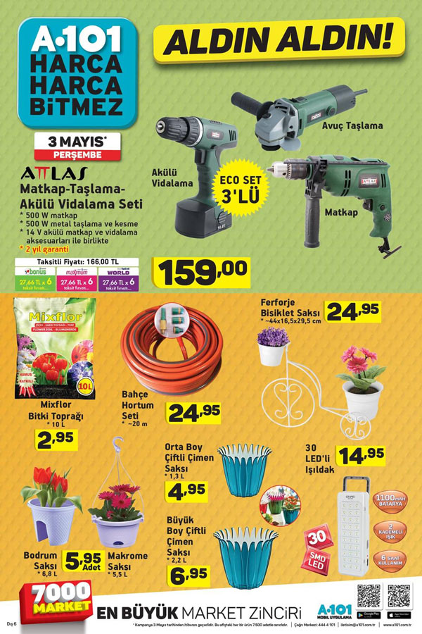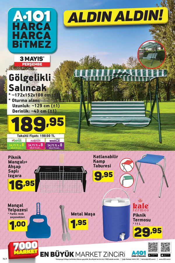 A101 indirim kataloğu 3 Mayıs 2018 perşembe gününden itibaren kampanyalı olarak satılacak ürünleri duyurdu. Henüz internet sitelerine ya da A101 mağazalarına henüz gelmiş olmasına rağmen birçok sitede yeni kataloglar A101 yayınlanmadı. Sizler için günün en çok merak edilen kampanyalı ürünlerini sunuyoruz. 81 ilde faaliyet gösteren A101 marketlerinde gelecek hafta neler gelecek diye soranların bu sorusuna yanıt veriyoruz. Yaz ayının yaklaşmasıyla bahçeli evi olanların özellikle almayı düşüneceği gölgelikli büyük salıncak A101 marketlerinde perşembe fırsatlarında görücüye çıkıyor. A101 piknik malzemeleri ile bu yazı nasıl geçirmeniz gerektiğini adeta sizlere haykırıyor. Mangal ve seyyar kapanır açılır tabure ile piknik termosu indirime girdi. A101 marketleri Türkiye’de diğer mağazalardan daha fazla şubeleşerek 7000’den fazla mağaza açtı. Alexa sıralamasına göre marketleri sıraladığımızda da A101 market internet sitesinin Türkiye’nin en fazla ziyaret edilen marketler zinciri internet sitesi oldu. Online katalogları ile en fazla takip edilen a101 com.tr bazı müşterilerin eleştirilerine de hedef oldu. Online katalogların geç yayınlandığı yönünde eleştirilere firmadan henüz yanıt gelmedi.