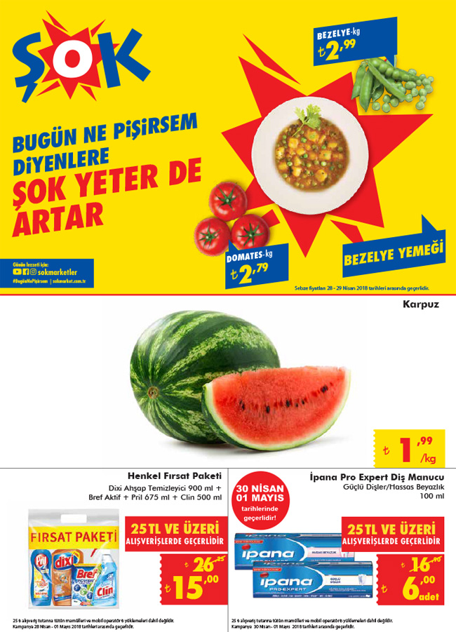 Şok markette bu hafta sonu indirim kampanyası yine sürprizlerle dolu. 28 Nisan 2018 cumartesi gününden başlayarak 2 Mayıs 2018 tarihine kadar reyonlarda satışları devam edecek olan indirimli Şok market ürünlerinin sınırlı sayıda gelecek olması, satın almaya karar verenlerin 28 Nisan günü sabahın erken saatlerinde market şubelerine gelmeleri gerekiyor. İndirim 2018 kampanyalarında nelerin olduğunu merak edenler için güncel Şok mağazaları indirim kataloglarını yayınlıyoruz. Hafta sonu 25 TL ve üzeri alışverişlerinizde indirimli olarak satılacak olan ürünleri de listeledik. Genellikle 25 TL ve üzeri alışverişlerde yüzde 50 indirimli olarak ayçiçek yağı satılmaktaydı bu hafta sonu hangi ürünlerde yüzde 50 indirim olacak. Şok market cumartesi ve pazar kampanyasında temizlik ürünlerinde fiyat indirimleri var. İpana diş macunu da bu haftasonu indirime giriyor.