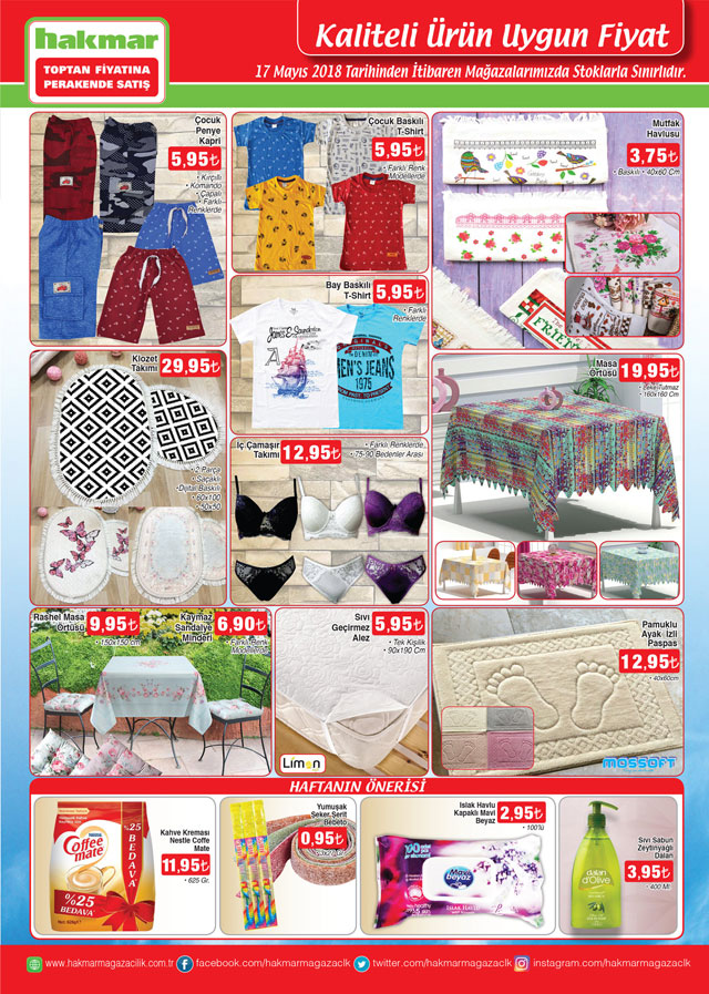 Hakmar Türkiye’nin en büyük marketler zinciri içerisinde 4. sırada yer alıyor. Kıyafetlerde indirim imkanı sağlayan marketin müşterileri elektronik ürünlerde indirimli fırsat ürünü getirilmemesine isyan etse de Hakmar pahalı ürünleri çok fazla getirmeye devam ediyor. Bunların yerine daha çok ucuz ve fiyatı düşük ürünlerin kampanyalı ürün olarak İstanbul başta olmak üzere Hakmar mağazalarında eş zamanlı olarak satışa sunulduğunu biliyoruz. Bu hafta 17 Mayıs 2018 Perşembe günü indirime sunulacak olan güncel indirim fırsatları ürünlerini incelemek için kataloglar aşağıdadır.