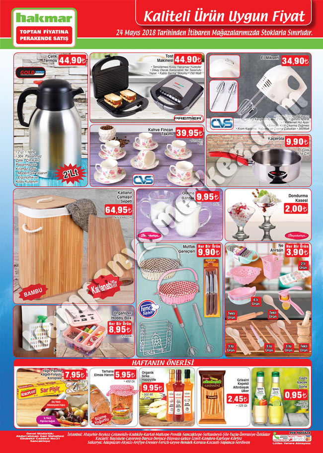 24 Mayıs 2018 tarihinden itibaren haftalık olarak yayınlanan Hakmar güncel ürün fihristi sitemizde bulunmaktadır. Hakmar Marketler zinciri indirimli aktüel fırsat ürünlerini her perşembe günleri mağazalarında satışa sunuyor. Bulunduğu yerlerde en çok seçenek edilen ve alışveriş yapılan marketler zinciri olan Hakmar marketleri her hafta pek çok çeşit kaliteli marka ürüne indirimli fırsatlarla fiyatlarda düşüşe imkan tanıyor ve reyonlarında da bu ürünlere yer veriyor.