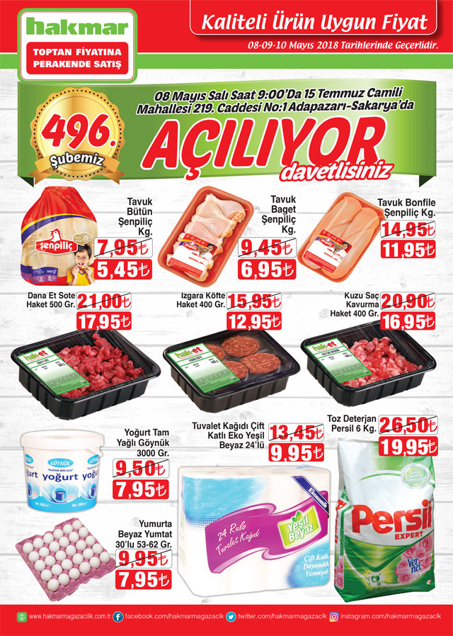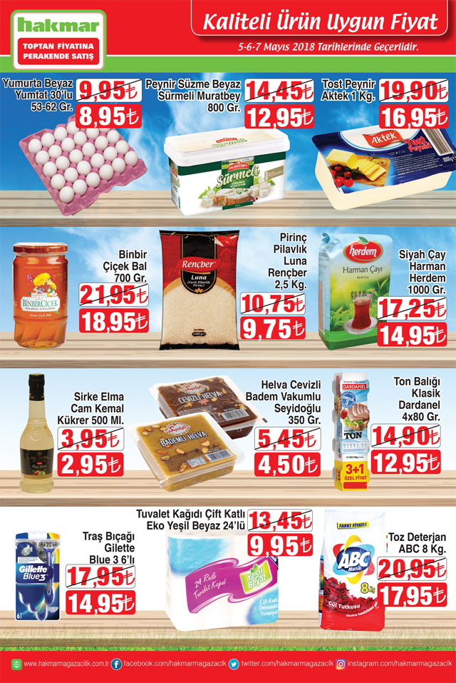 Hakmar mağazalarında 7 Mayıs 2018 tarihinden itibaren indirime girecek ürünler 8 ve 9 Mayıs 2018 tarihlerinde de indirim reyonlarında satılmaya devam edilecek. Gıda ürünlerinde başlatılan kampanyaları takip etmek için aşağıda vereceğimiz aktüel katalogları inceleyebilir, ucuzlayan Hakmar Ekspres ürünlerinden ihtiyacınız nispetinde alışveriş yapmak üzere alacağınız ürünlere karar verebilirsiniz.