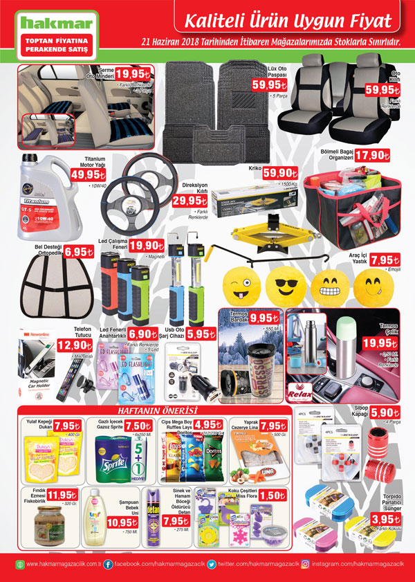 Oto paspası arayanlar için lüks oto paspası bu haftanın indirimli bir diğer ürünü. 5 parçadan oluşan paspas sert plastik ve kıldan mamuldür. 59,95 TL’ye satılacak paspasların stoklarla sınırlı olduğunu söylememize gerek yok belki de. En fazla rağbet gören ürünler arasında olan araba paspaslarının uygun fiyata gelecek olması, 21 Haziran günü bu ürünün tükenmesine neden olabilir. Bu yüzden acele etmenizi öneririz. Oto koltuk kılıflarında da Hakmar 21 Haziran aktüel fırsat ürünlerinde indirim uygulanacak. Farklı renk seçenekleri ile satışa sunulacak oto koltuk kılıfları sadece 59,95 TL’den satışa sunuluyor. Direksiyon kılıfı indirimi, arızalarda ve beklenmeyen durumlarda kullanmanız için krikolarda da indirime gidiliyor. Bölmeli bagaj çantası Hakmar fırsat ürünlerinden bir diğeri. Bu ürün de düğer muadillerinden fazlaca uyguna satılacak. Hakmar led çalışma feneri magnetli olanından ve gayet kullanışlı bir ürün olmasına rağmen çok ucuz bir fiyata satılacak.