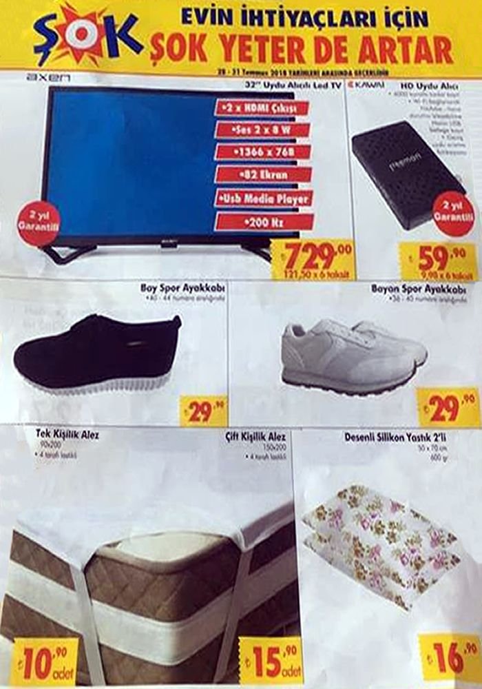 Şok market haftasonu (28-29 Temmuz 2018) indirim kataloğunda Axen 32″ televizyon 729 TL fiyatla satılacak. Kawai uydu alıcı 60 TL, bay bayan spor ayakkabı 30 TL olarak satışa sunulacak. İşte Şok aktüel ürünler kataloğu:
