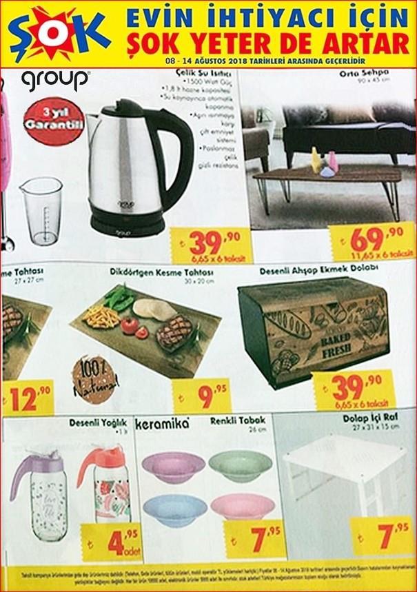 28 Temmuz’da satışa çıkan ürünler arasında “Evin ihtiyaçları için ŞOK yeter de artar” sloganı ile başlayan sayfada 10,90 TL ücreti ile tek kişilik alez ve 15,90 TL ücreti ile çift kişilik alez bulunuyor. Desenli 2’li silikon yastık 16,90 TL’den satışa sunuluyor. Cumartesi günü mağazaya gelen ürünler arasında bay ve bayan spor ayakkabı çeşitleri de bulunuyor. Spor ayakkabılar 29,90 TL’den satışta. 8 Ağustos’ta King marka blender seti 6 taksit fırsatı ile 129,90 TL’den, Remington marka hava üflemeli şekillendirici 79,90 TL’den satışa çıkıyor. 7,95 TL ücreti ile broşürde yer alan Titiz marka pratik süzgeç yurttaşların hayatını kolaylaştırıyor. 3 sene garantili Remington marka saç kesme makinesi 29,90 TL’den, 2 sene garantili çift başlıklı tıraş makinesi 59,90 TL’den satışa çıkıyor.