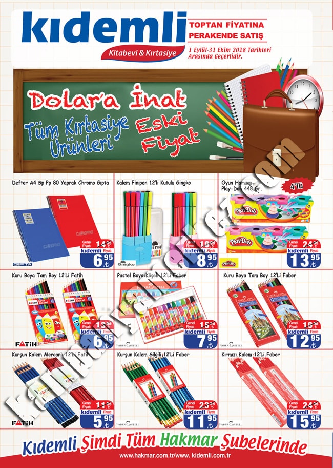 Hakmar dolar kurundan müşterisini etkilememek için okul malzemelerinin fiyatlarını sabitledi. Bir ay boyunca aktüel fırsat kataloglarında yer alan ürünlerin satışı Hakmar market şubelerinde sürecek. Hakmar aktüel ekspres bülteninde yer verdiği öğrencilere yönelik kampanyalı ürünlerini 1 Eylül 2018 ile 31 Eylül 2018 tarihleri arasında şubelerinde indirim reyonlarında satacak olan Hakmar’ın kampanyalı ürünleri içinde yok yok adeta.