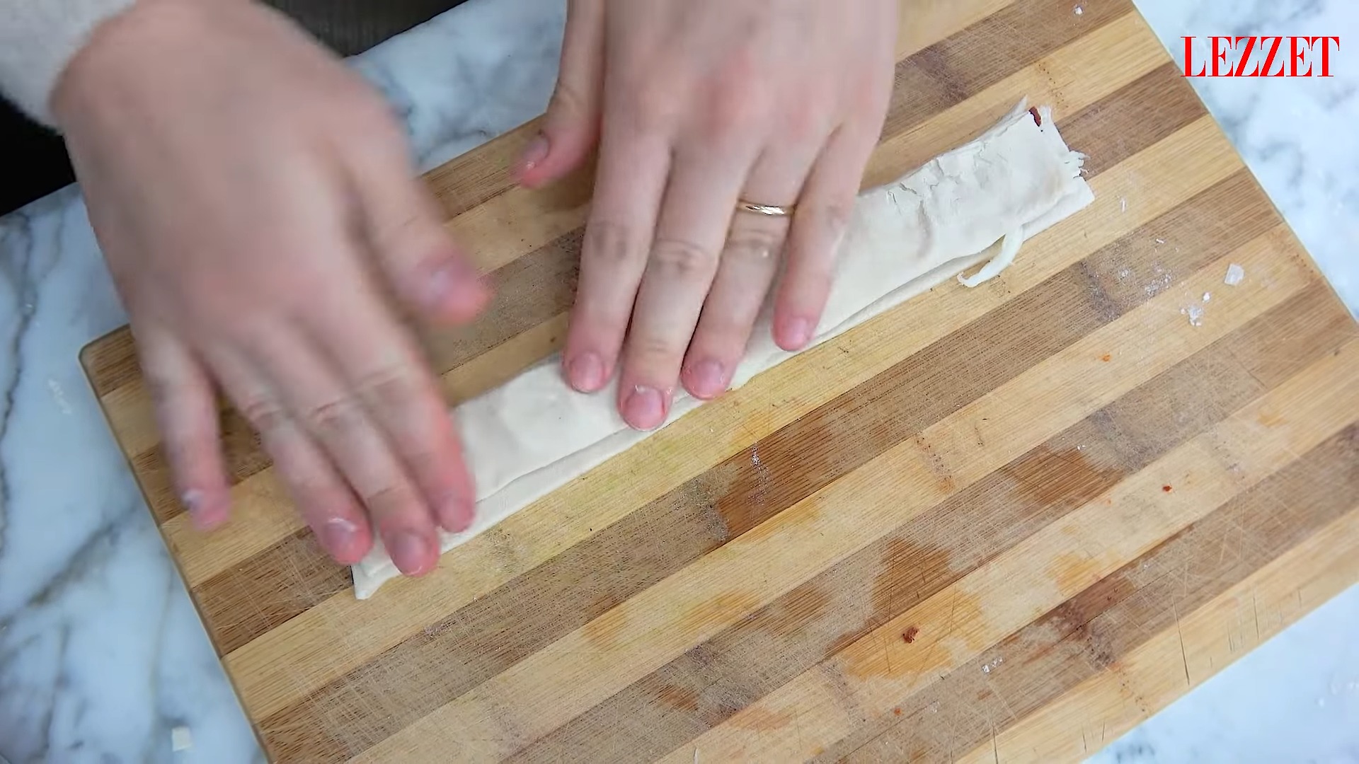 - Şeritlerin içerisine pastırma ve çeçil peyniri ekleyin.